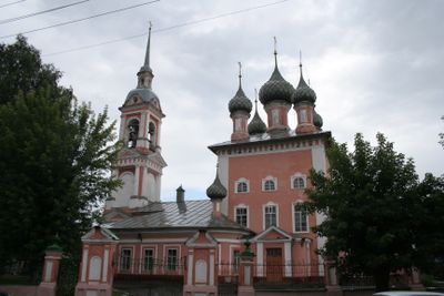 Saint John Chrysostom Church is an Orthodox house of worship in Kostroma featuring multiple cupolas and ornately decorated exterior surfaces that display classic Russian church design. The structure has a square layout with a central dome and additional smaller domes at the corners, which shape its distinctive profile.