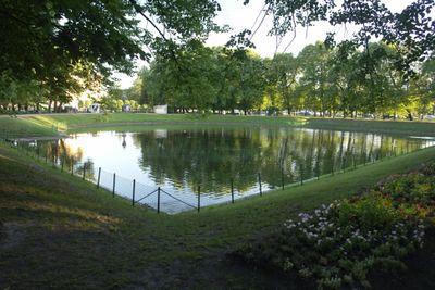 The rectangular pond with stone borders occupies the southern section of Summer Garden, reflecting surrounding trees and architectural elements in its waters.