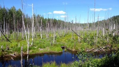 The Kerzhinsky Nature Reserve encompasses 46,856 hectares of wetlands, forests, and river ecosystems along the Kerzhenets River in central Russia.
