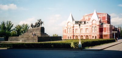 Chapayev monument depicts a general on horseback surrounded by seven bronze figures at the base, each representing different people from the Russian Civil War period. The entire work sits on a large stone base located in front of the drama theatre on Chapayev Square.