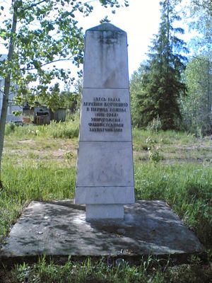 The memorial marks the location of Korovino village, which was destroyed by enemy forces during World War II, receiving cultural heritage status in May 1988.