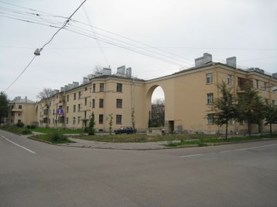 The residential complex represents Soviet constructivist architecture from the early 20th century, emphasizing functionality and modern materials in its design.