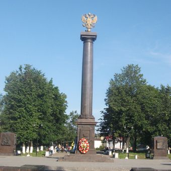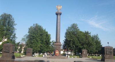 The Monument to City of Military Glory features a tall granite column with bronze elements, standing prominently in the urban center of Luga.