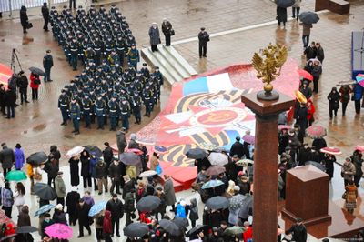 The granite and bronze column rises 6.5 meters high in front of the Municipal Cultural Center, featuring the Russian national emblem at its peak.