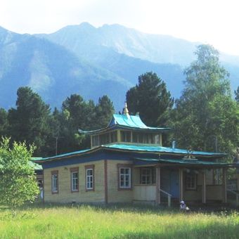The Khoymorsky datsan stands at 835 meters altitude in the Tunkinsky District, near mineral springs and against the backdrop of the Sayan Mountains.